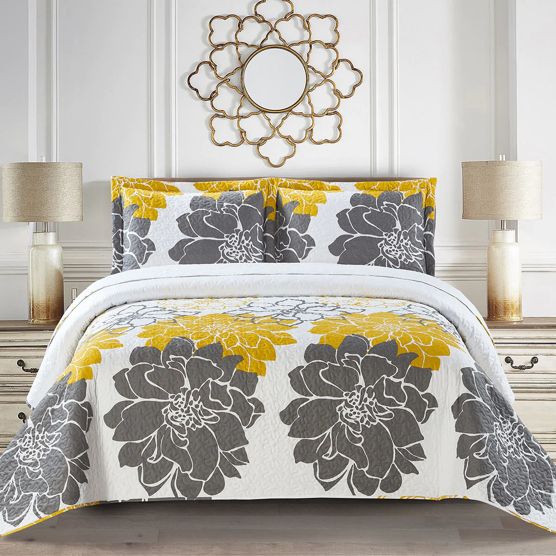 Bring a soothing and relaxing touch to any bedroom with with our unique Helena Gold Bed Quilt Set as the lovely design that come in an exquisite color combination of beige background with Gold and Grey flowers. These Bedspreads are made of 100% Microfiber Cover -Single-ply woven with long staple fibers for superior levels of quality- Filled 100% Polyester Filling. These Coverlet Sets are Hypoallergenic, Soft Yet Durable, Wrinkle-Free & Pet-Hair Resistant.