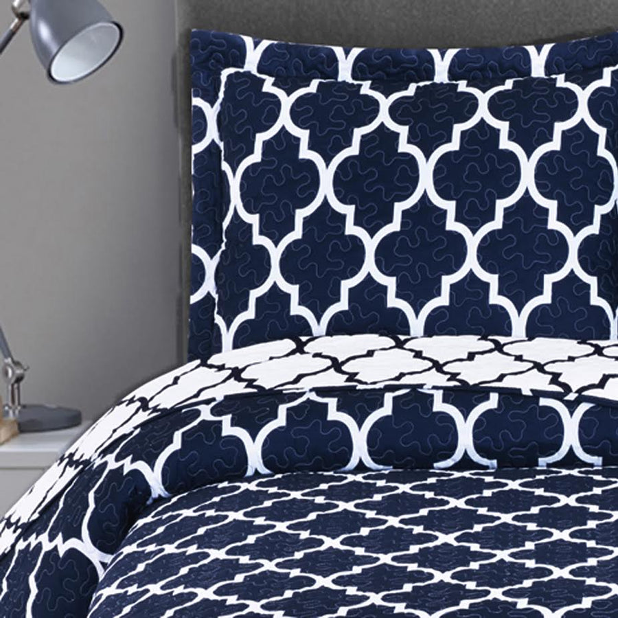 Makeover your bedroom with this beautiful and comfortable Meridian quilted coverlet set, Featuring a geometric pattern in beautiful bright colors that will bring life into your sleep space.this Meridian Quilt bedding sets comes complete with one coverlet and two pillow shams (one for twin bed size). Furthermore, All sizes available in Navy/White and Gray/White Colors